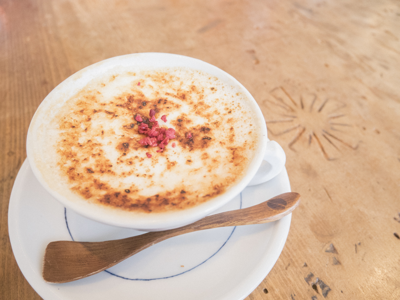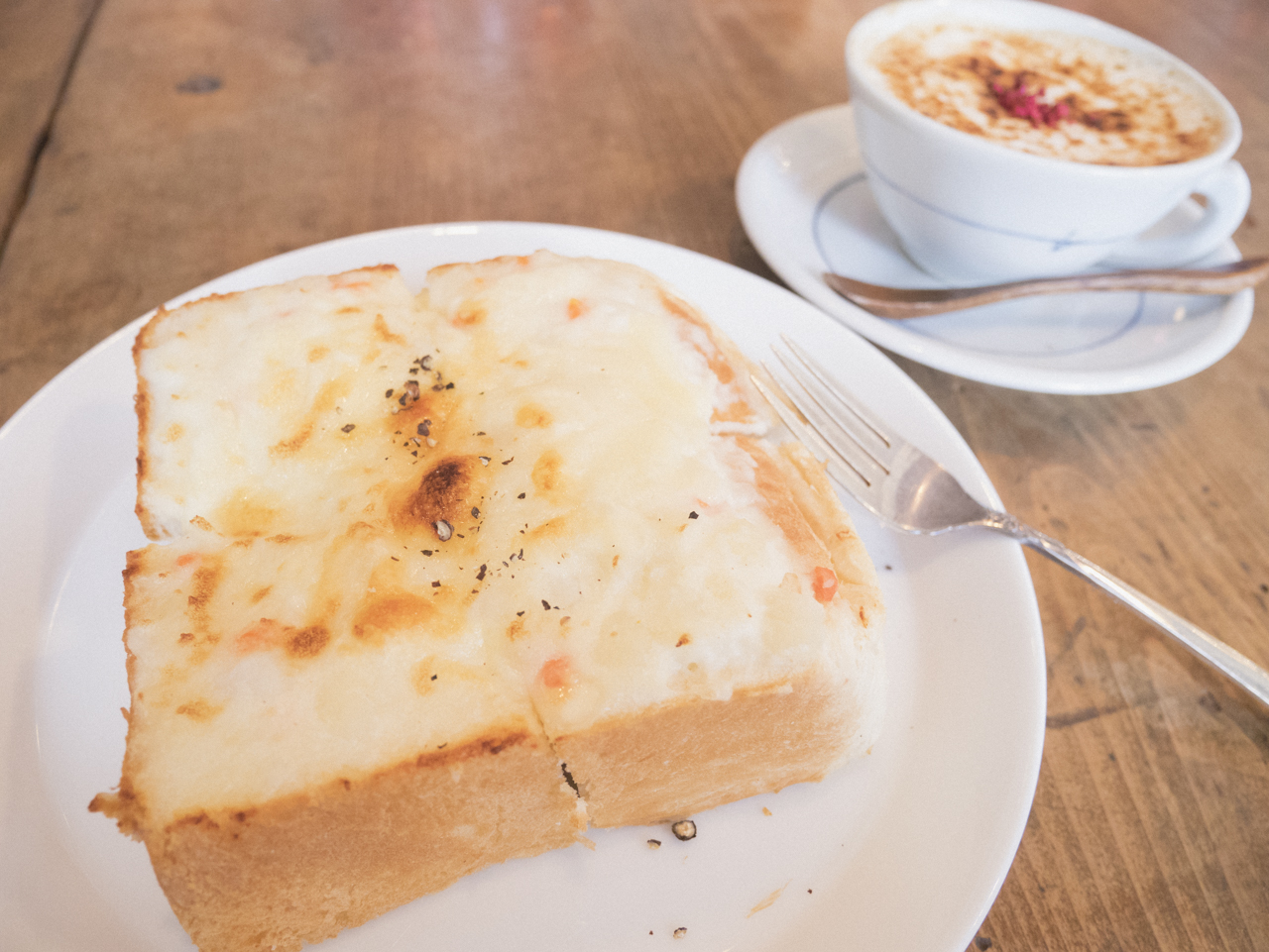 遅めの昼食にポテトチーズトーストを。季節限定のGrilled Latteは表面をパリパリにキャラメリゼしてあったので、少しすくって食べてみると‥香ばしくてとっても美味しい!甘さも、アクセントのドライフルーツの酸味もバランスよく、天国のようなスイーツラテでした☺