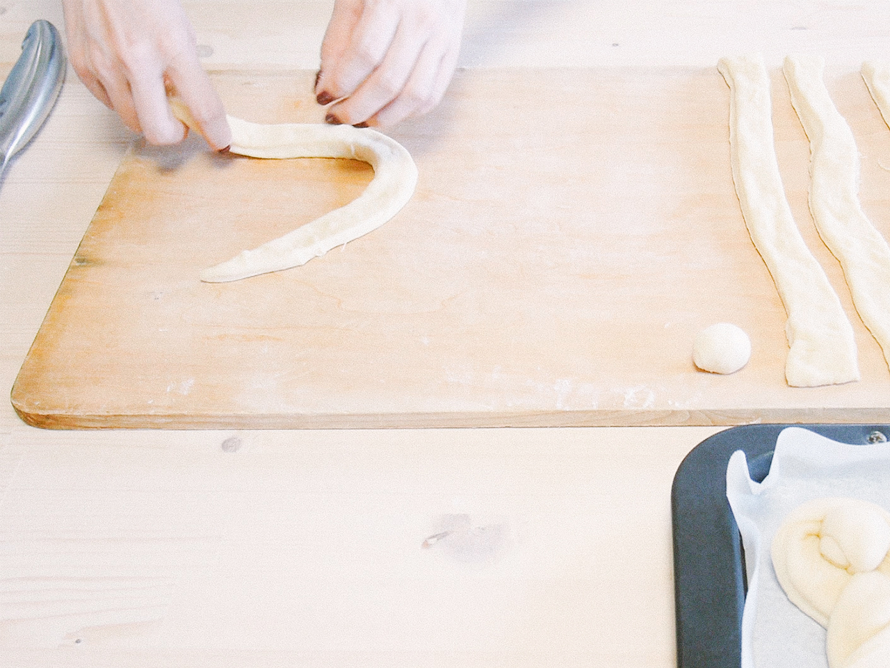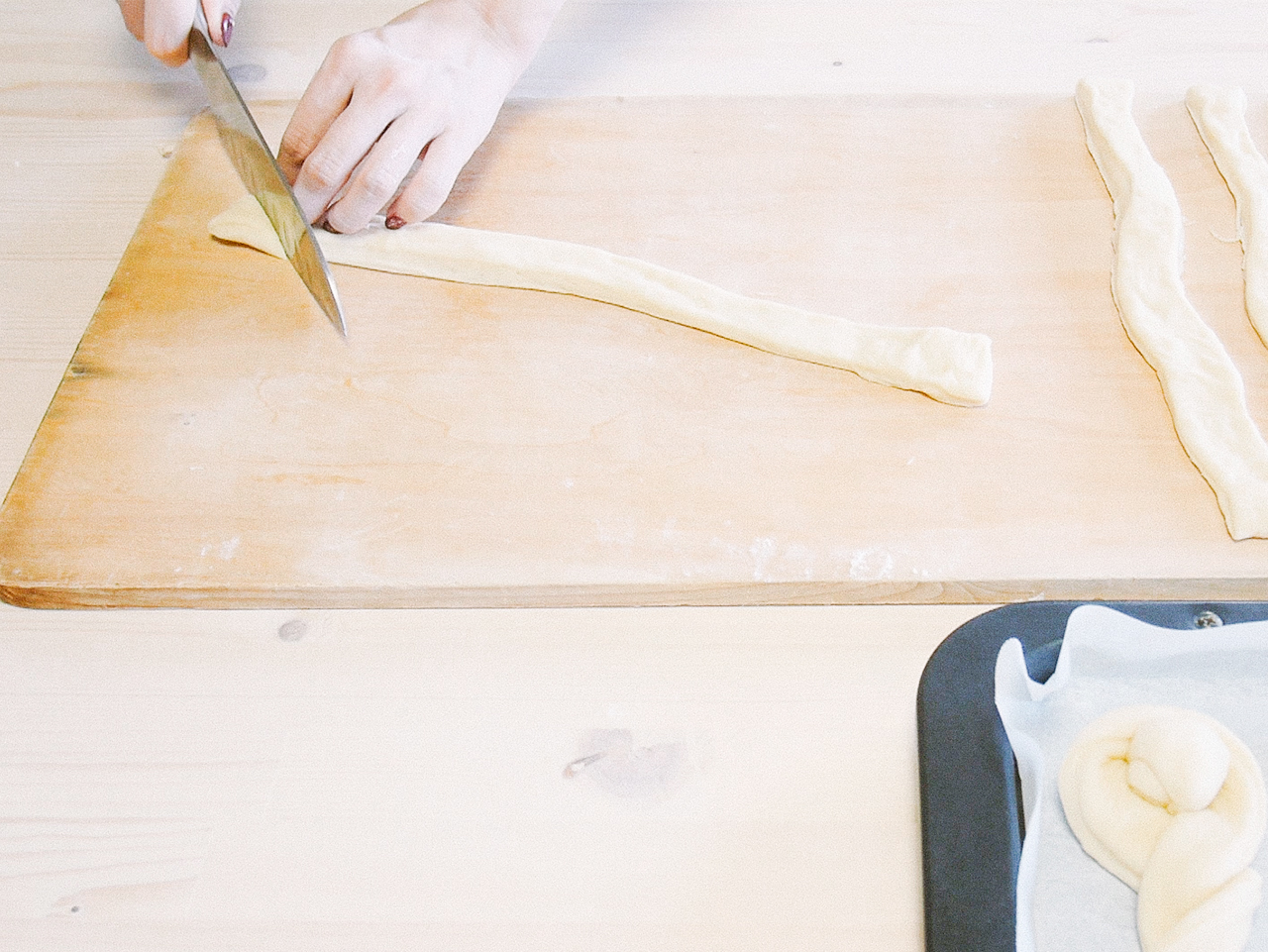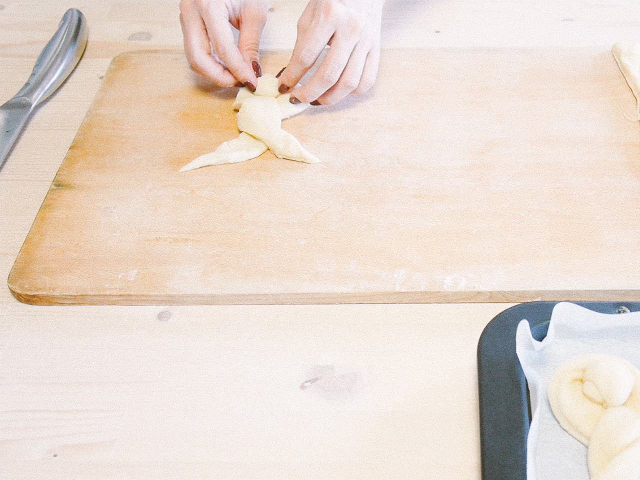その間に次の工程の準備をしましょう!ペストリーボード(変わりにまな板やシートでもOK!)と麺棒を用意して、粉をふっておきます。オーブンは180℃に予熱、天板の準備も忘れずに。