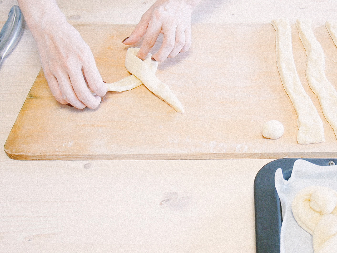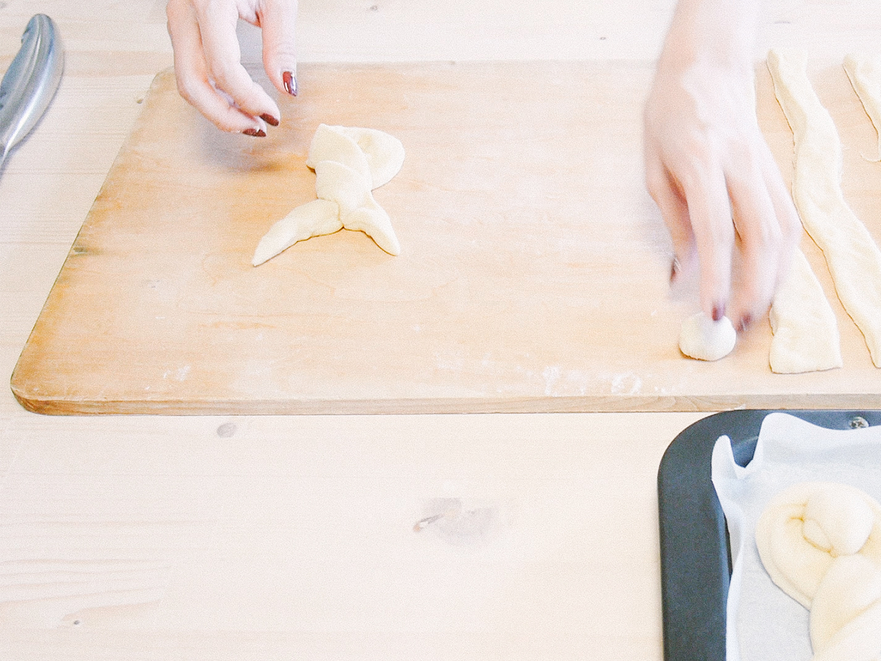 生地の端を斜めに切ったら、両端を持って2回くるくるとねじってうさぎの形にします。切った端切れの生地を丸くして、しっぽに乗せたら天板に並べて卵を塗ります。