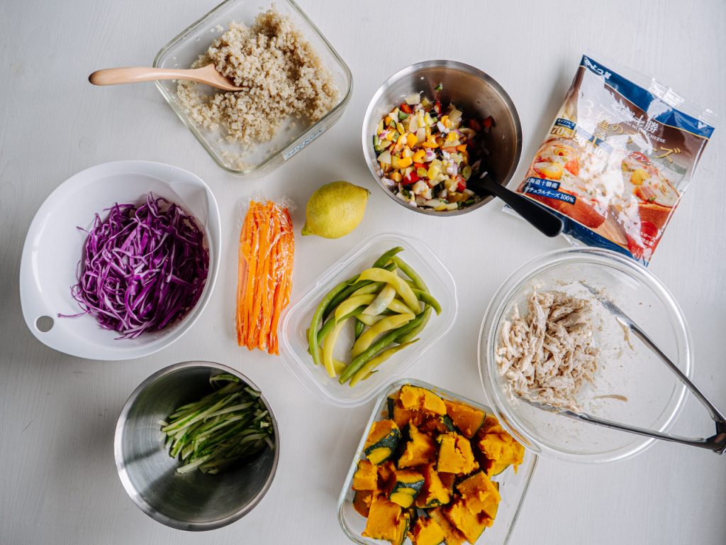 キヌア,紫キャベツ,ニンジン,黄いんげん&いんげん,きゅうり,かぼちゃ,鶏肉,豚ひき肉,チーズ,レモン、写真には写ってないけどアボカドも後で加えました。