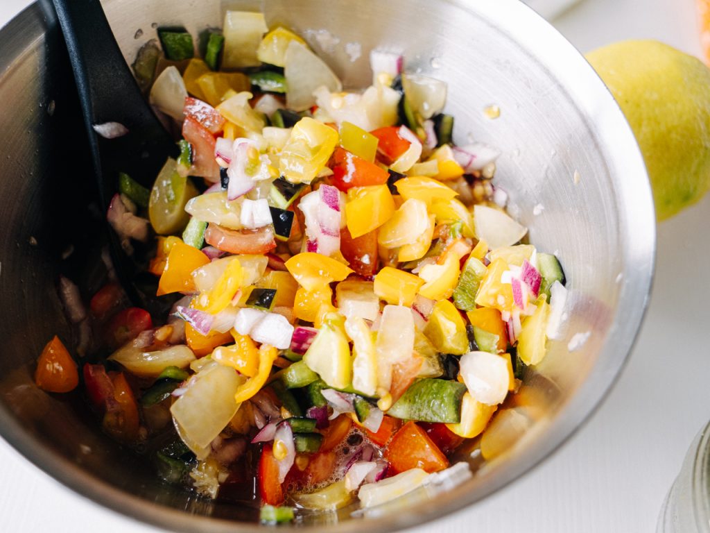 トマト+ピーマン+玉ねぎにレモンとニンニクすりおろしを少し加えて塩で味を調えます。