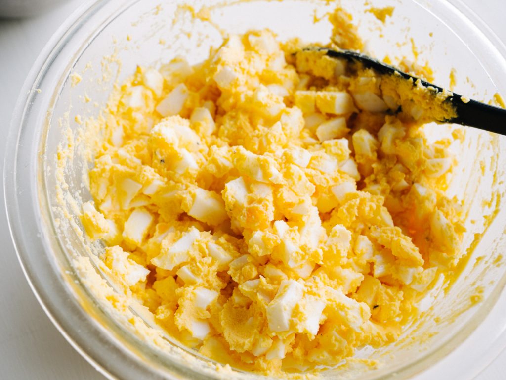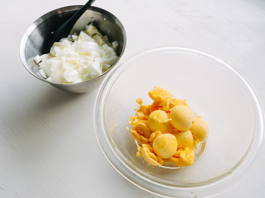 白身と黄身を分けて取り出して、白身はエッグスライサーを使ってさいの目状に。