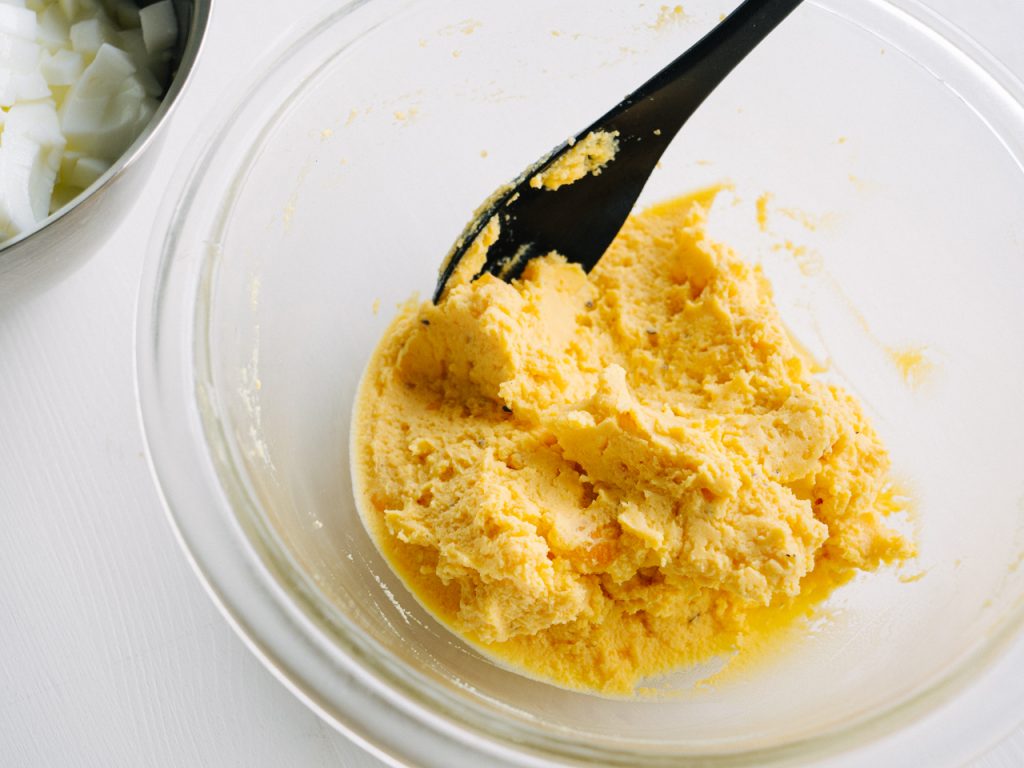 黄身にマヨネーズとバターとほんの少しの生クリーム&はちみつを入れて塩コショウで味を調えたら、滑らかなペースト状になるまで混ぜ合わせます。