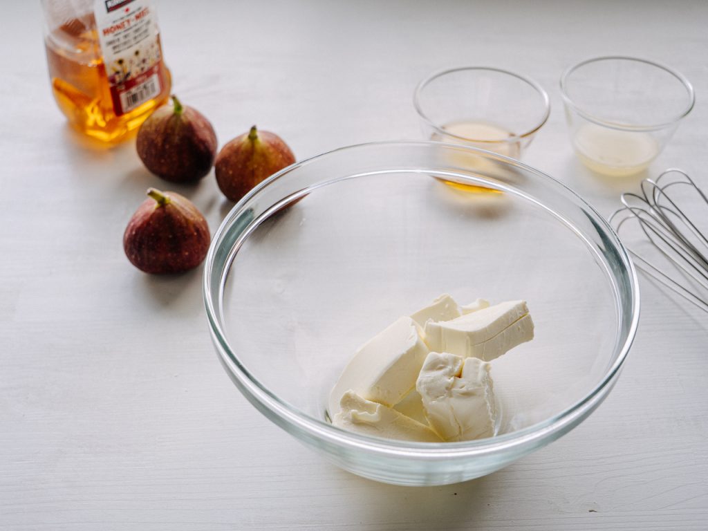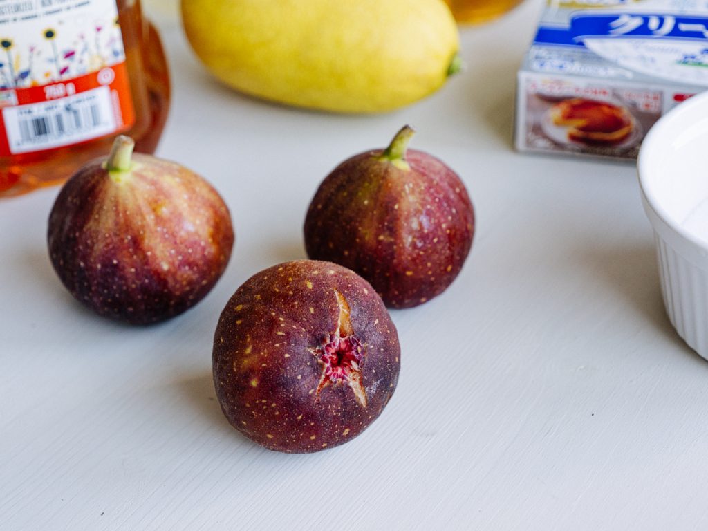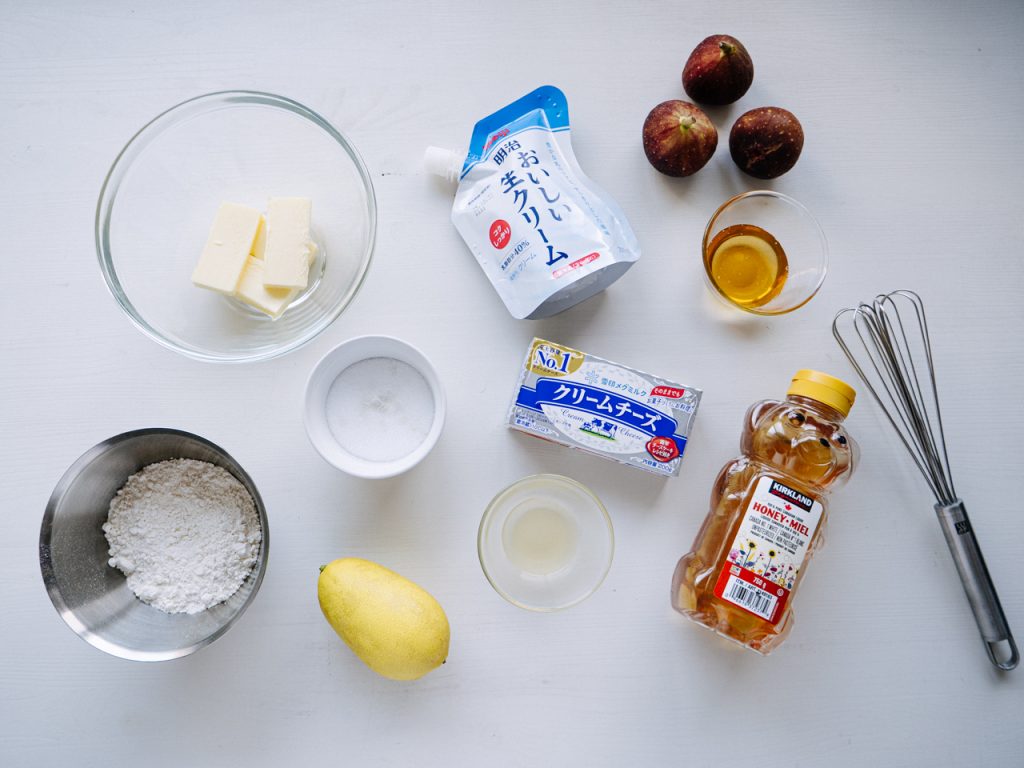 材料はいちじく、バター、薄力粉、グラニュー糖、塩、生クリーム、クリームチーズ、レモン汁はちみつ🍯