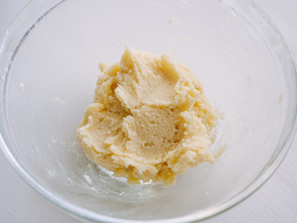 室温に戻しておいたバターをボウルに入れて、グラニュー糖&塩を加えてよく混ぜ合わせます。なめらかになってきたら薄力粉を加えて、手に少し重みを感じるくらいまで混ぜてひとまとめに。