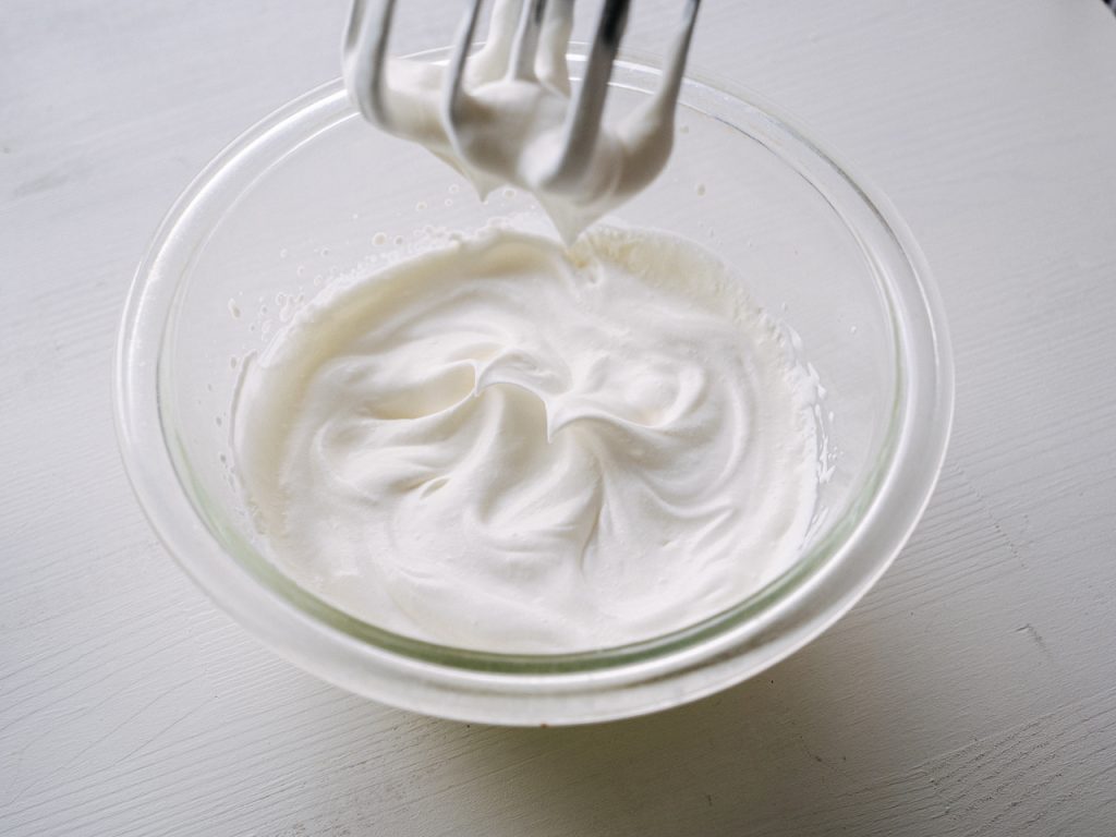 そこにレモン汁を少しずつ加えながら、8分立てくらいの少し硬めに仕上げます。レモンを入れると固まりやすいので様子を見ながら調整するのがポイント。