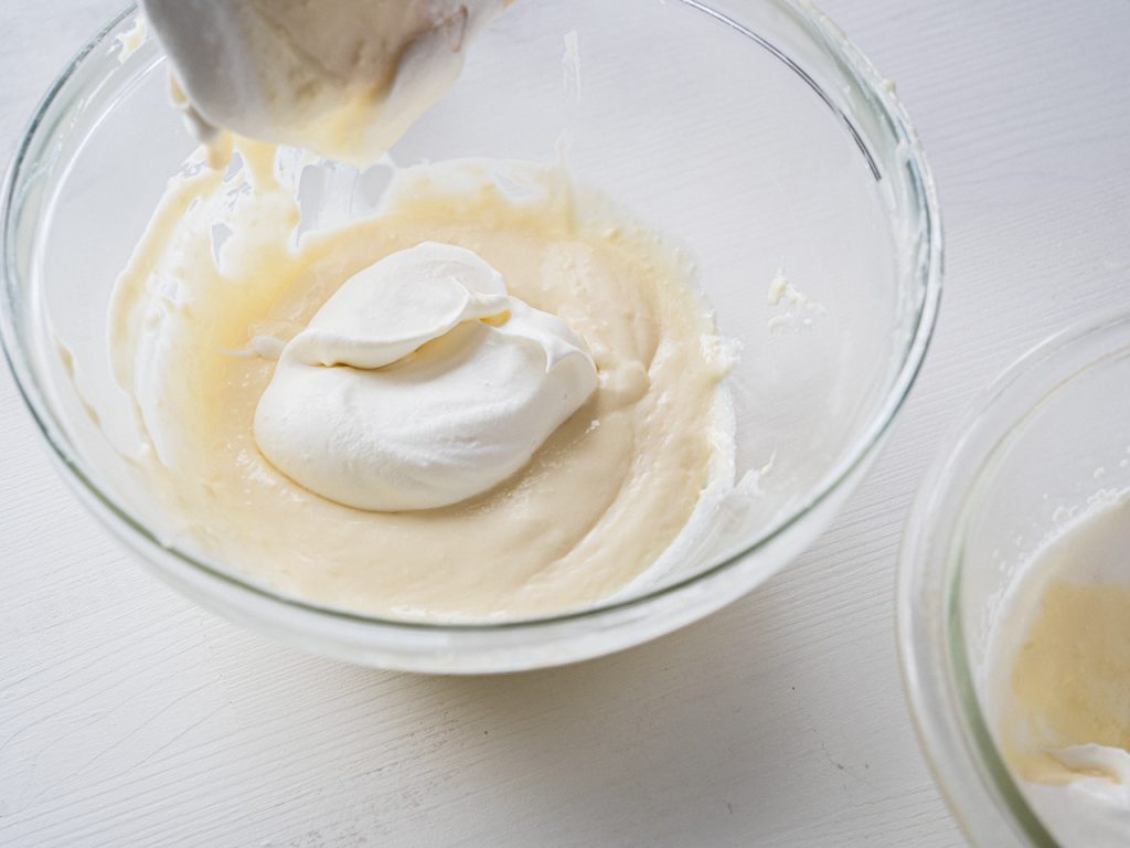泡立てた生クリームをクリームチーズの方にひとすくい加えてなじませ、そのあとで残りをすべて合わせてやさしく混ぜます。