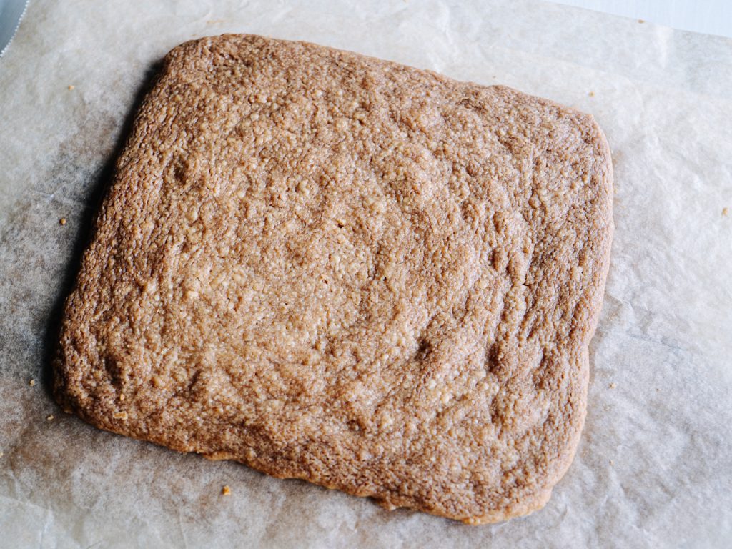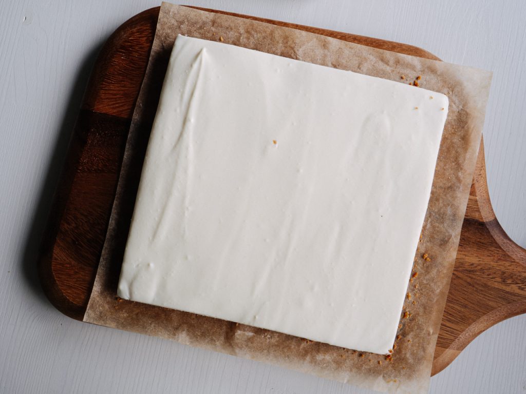 スクエア型があればよかったけどちょうどいいのが無かったので、クッキングシートの上に置いて自力で四角く成形します。