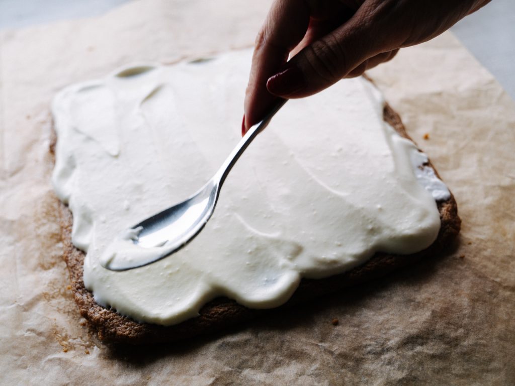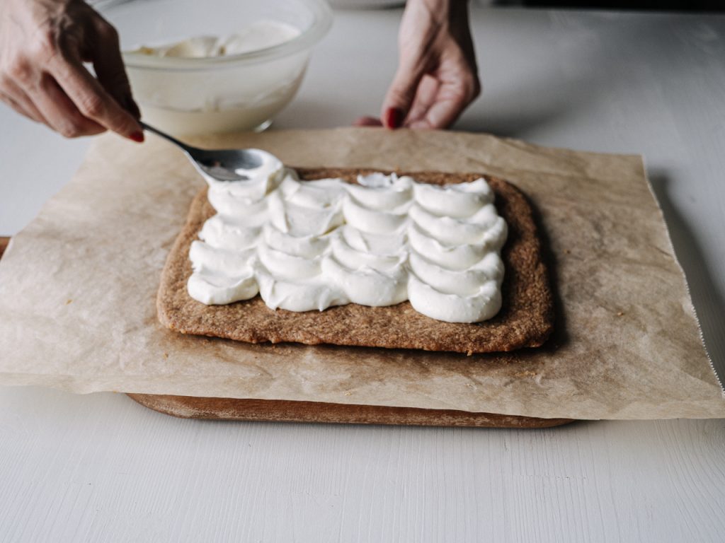クリームをたっぷりとのせて平らにならしたら冷蔵庫で最低30分冷やし固めます。