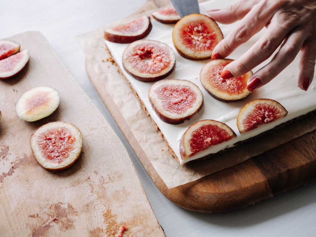 しっかりクリームが固まったのを確認したら、冷やしたタルトの端を包丁できれいにカットして、そこにいちじくを並べていきます。