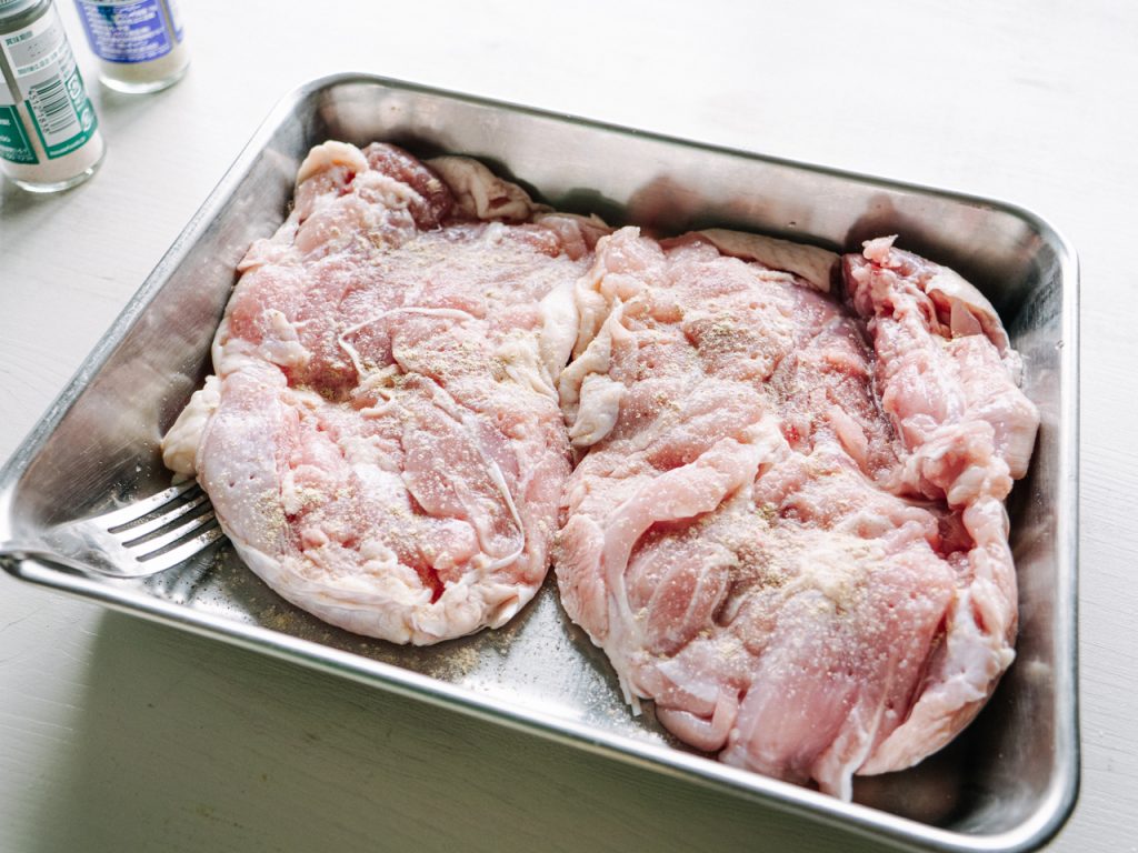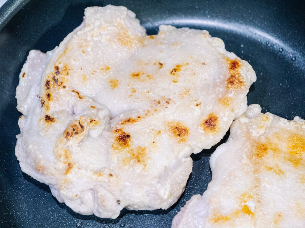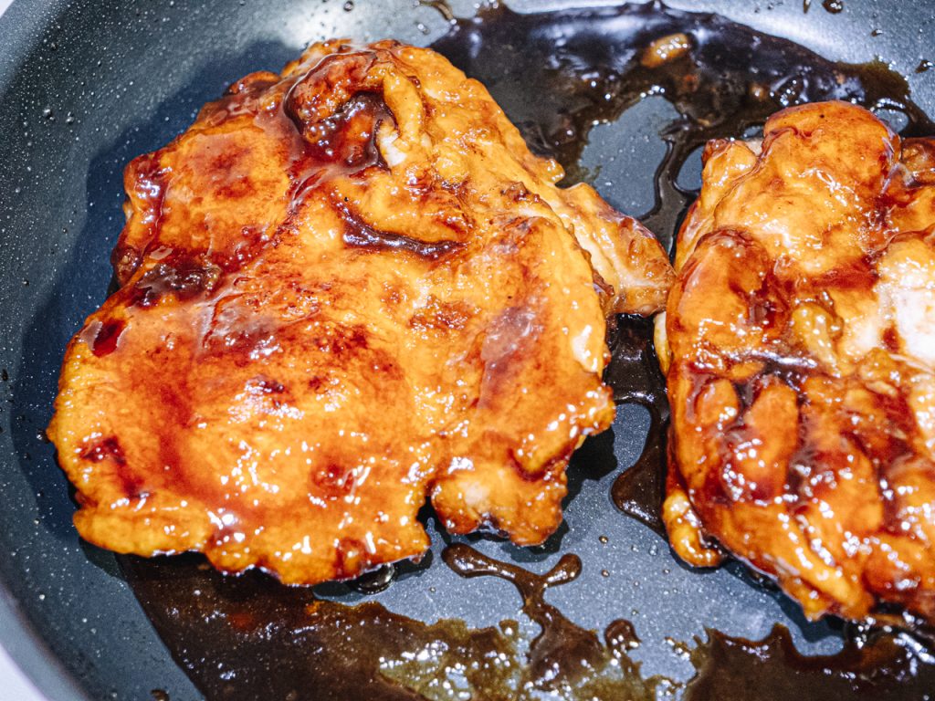 鶏肉全体をフォークで刺したあと、軽く塩コショウしてフライパンで片面3分程度ずつ焼き色を付けたら、お醤油・みりん・お砂糖を2:2:1くらいの比率で合わせた調味料を加えて蓋をして強めの弱火で5分ほど加熱してしっかり火を通します。
