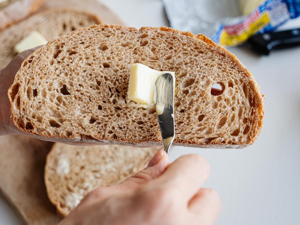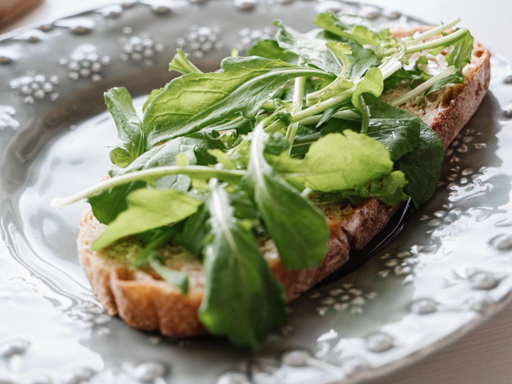 オープンサンドはバゲットにバターを塗ってルッコラとハムとチーズをのせただけ。