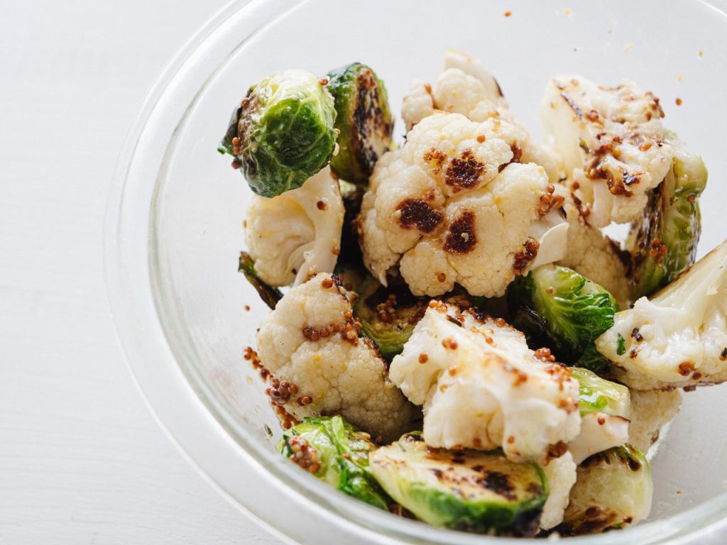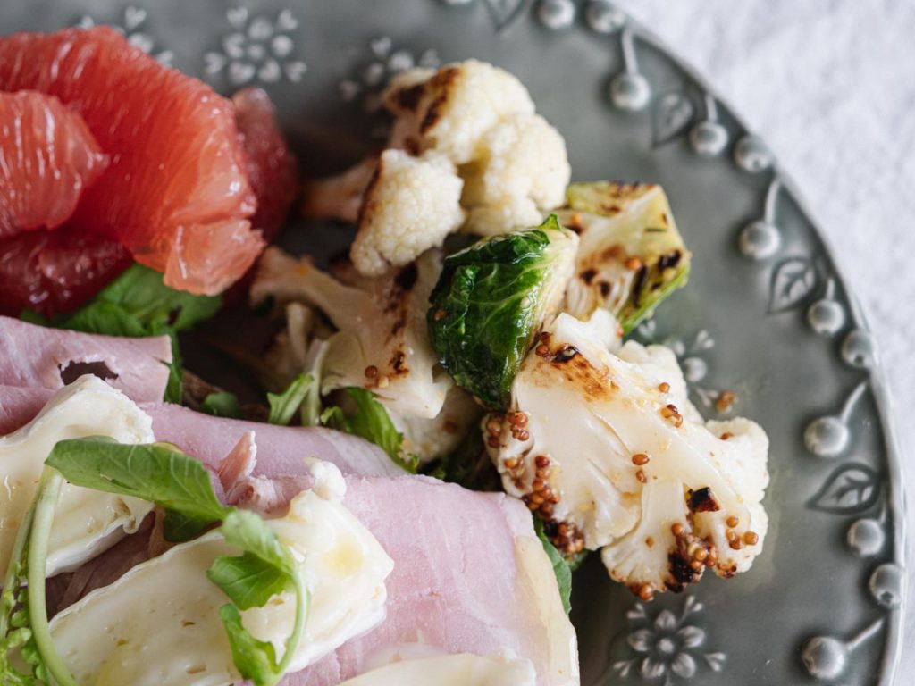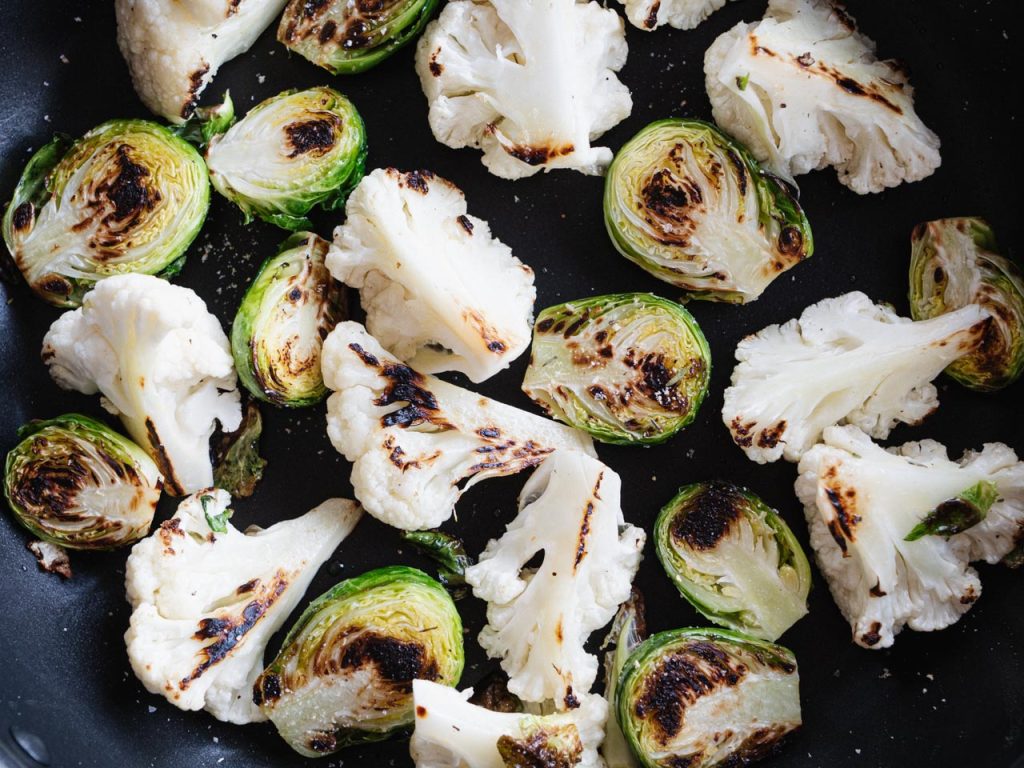 カリフラワーは食べやすい大きさ、芽キャベツは半分に切ってオリーブオイルをひいたフライパンでなるべく動かさないようにじっくりと焼きます。