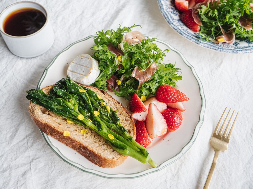 バターをたっぷり塗ったバゲットに菜花の甘みが最高。いちごとカマンベールチーズの相性もすごく良くてとっても美味しい一皿でした🍽️