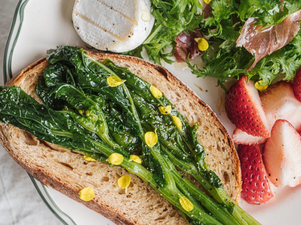 春は大好きな菜花をたっぷり食べたいので、この日は焼いた菜花をバゲットに乗せてオープンサンドにして食べることにしました。