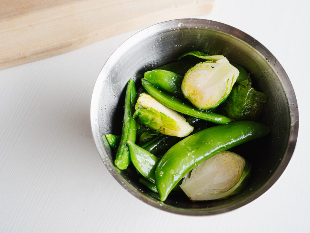 緑の野菜は1分30~2分くらい茹でてオリーブオイルと塩コショウでマリネ。