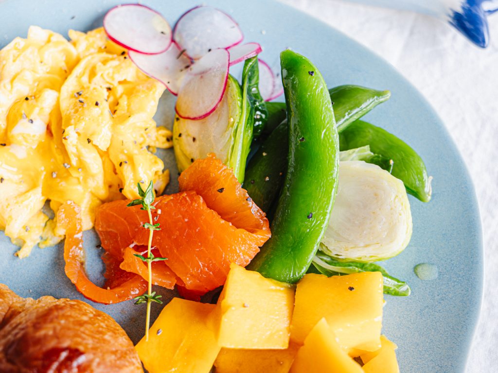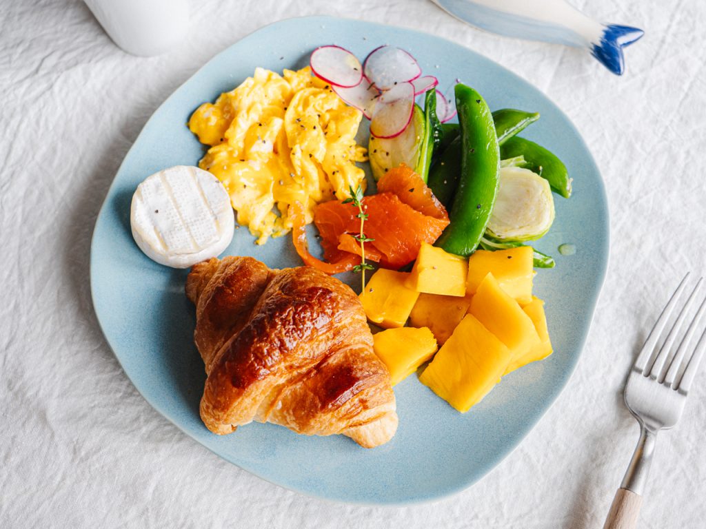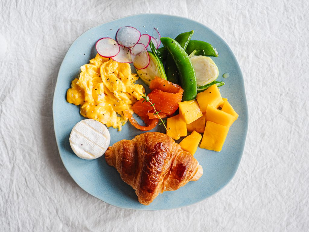 スクランブルエッグとサーモン、フルーツ、チーズをのせたら完成。