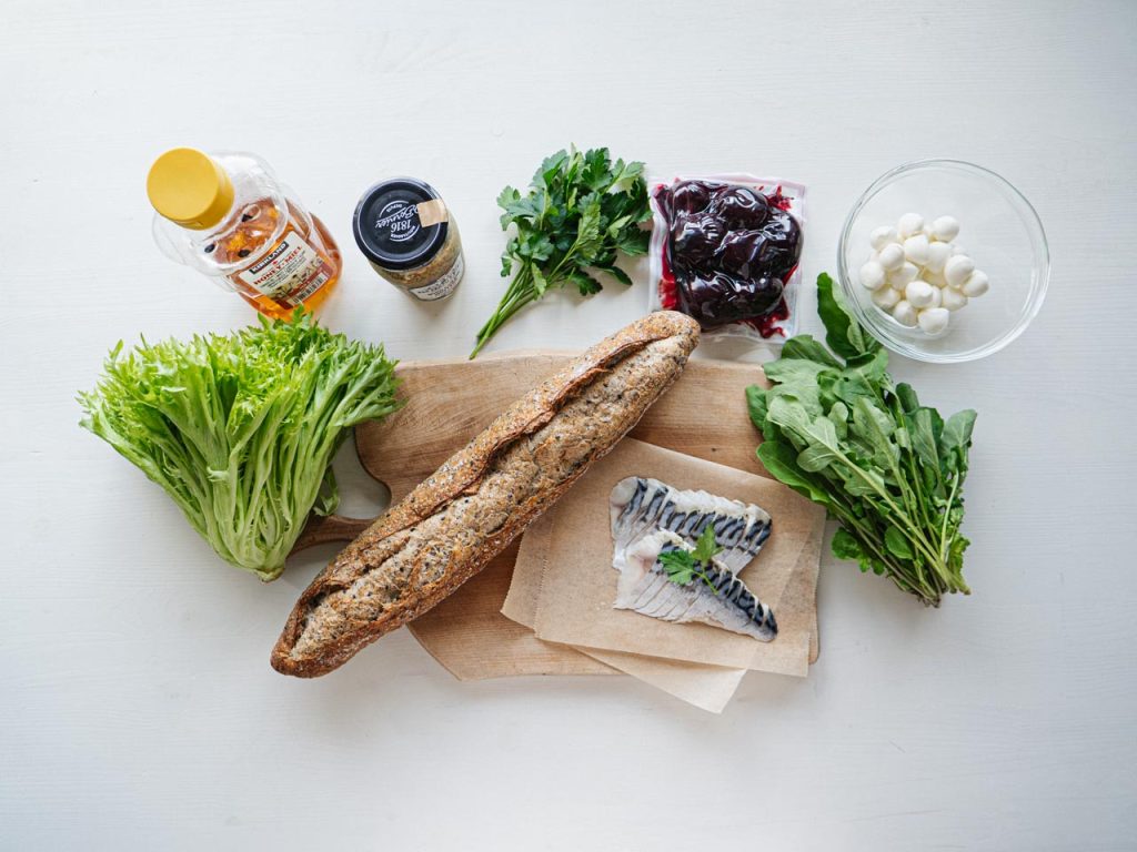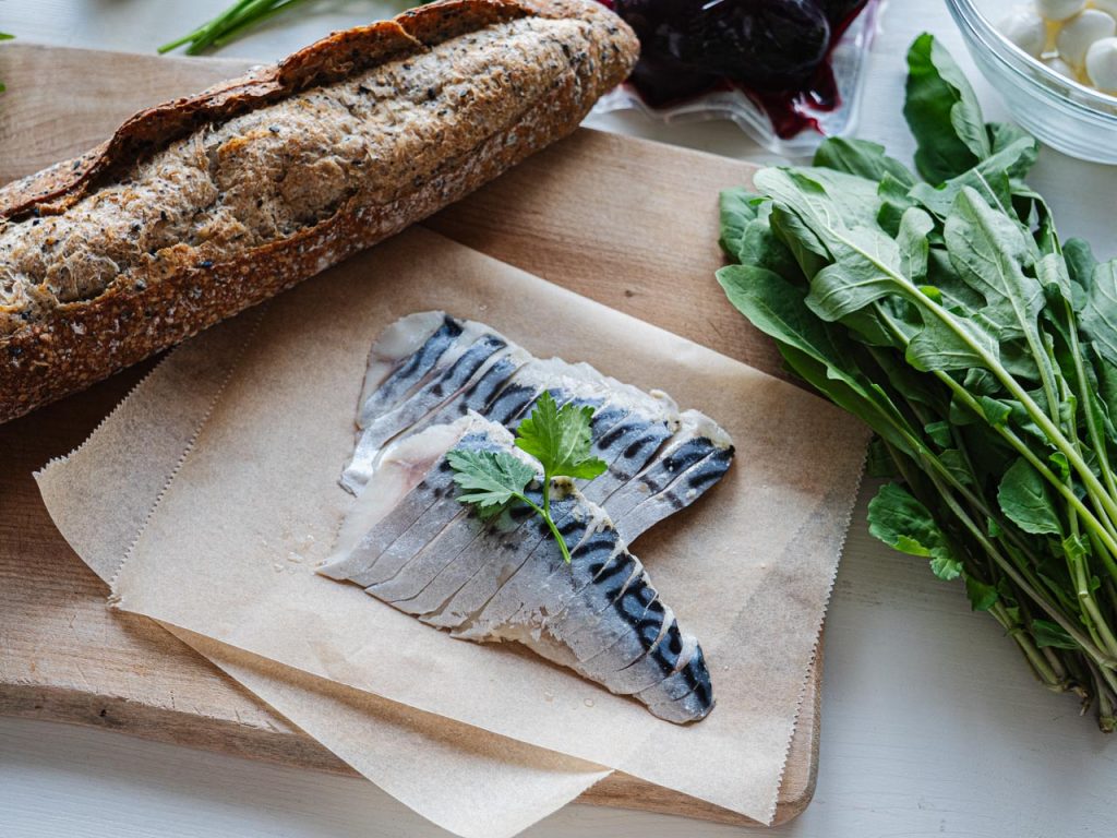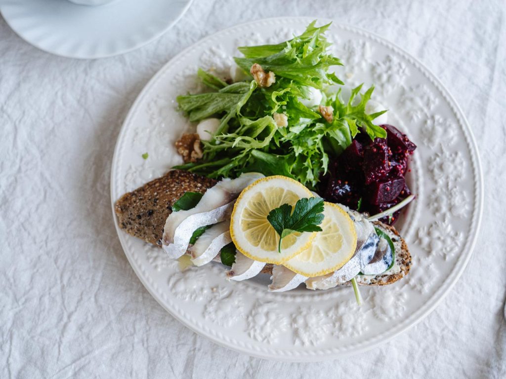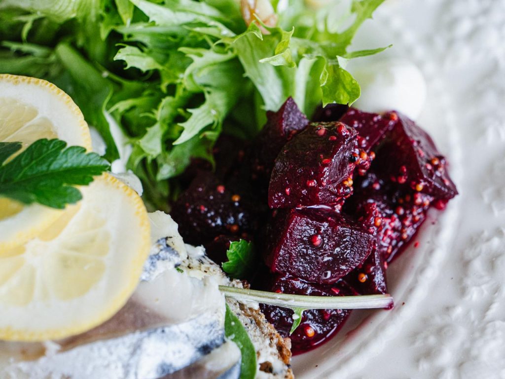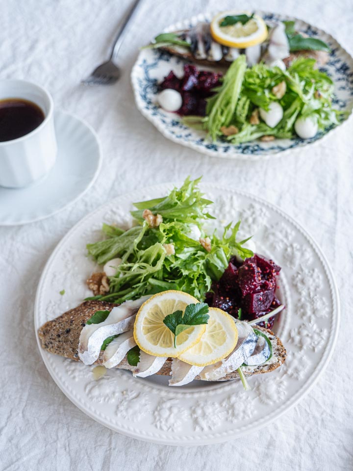シメサバのオープンサンドとビーツのサラダ。