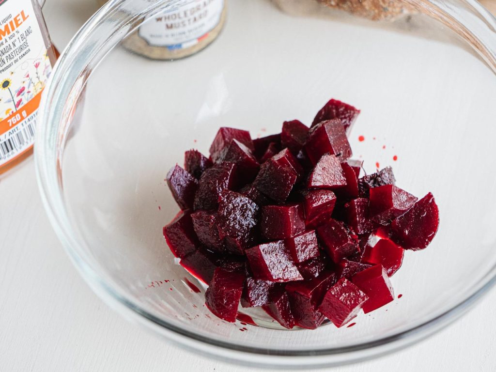 ビーツはサイノメ切りにしてマスタードとはちみつに軽く塩を加えてマリネしただけのシンプルなサラダ。